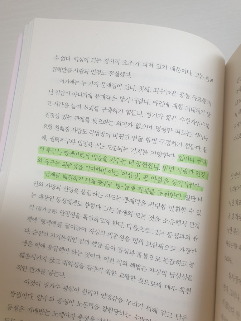 교도소를 군대와 똑같다고 할 수는 없다. 교도소 내에서는 짬밥에 의한 지위 상승이 보장되지 않기 때문이다. 오래 산다고 서열이 높아지는 것은 아니라는 뜻이다. 이 때문에 교도소 내에는 항상 위계의 불안정성이 존재한다. 오히려 이 불안정성으로 인해 수감자들은 군대보다 압축적이고 효율적으로 남성성을 학습한다. 그들은 군인보다 더 열심히 힘을 과시함으로써 남성성을 수행한다. 칠칠치 못한 근육을 보이거나 자신의 왕년 행보를 자랑한다. 남자가 되는 것을 꾸준히 실천하고 있음을 온몸으로 증명하면 서열에서 높은 지위를 차지할 수 있다. 가부장제 사회에서는 남성성이 곧 인간성을 의미하기 때문이다. 위계구조에서 배제되지 않으려면 남성성 수행이 필수적이다.