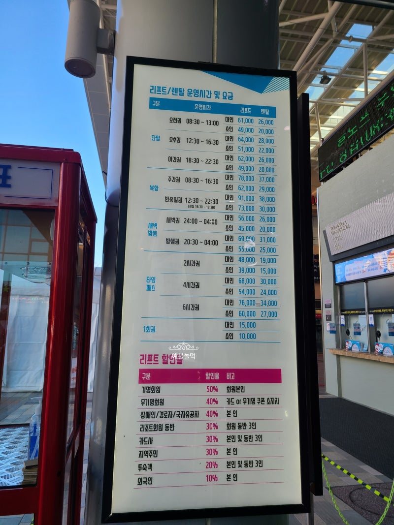 리프트 3시간 렌트 4시간권으로 2명 결제! 난 무기명 회원이라 40% 할인된 가격에 구매했어. 정설 시간 16:30 ~ 18:30