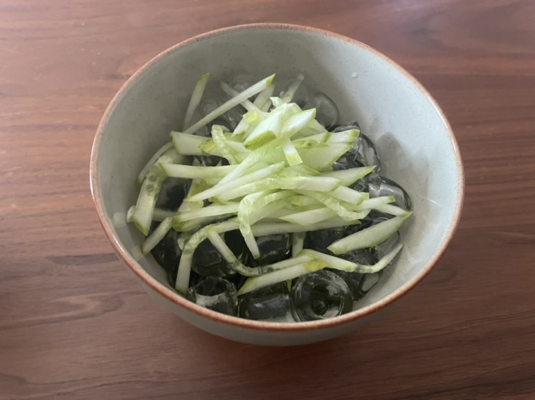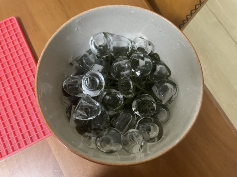 미역면은 물 빼고 한번 씻겨줬어요 그리고 일단 그릇에 담고 얼음을 같이 넣어요