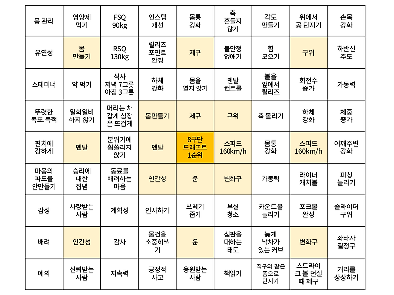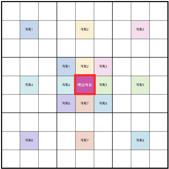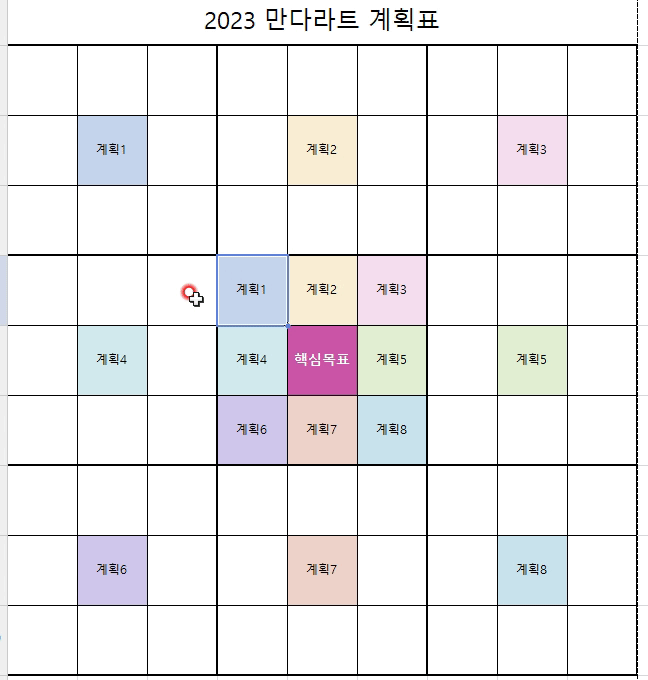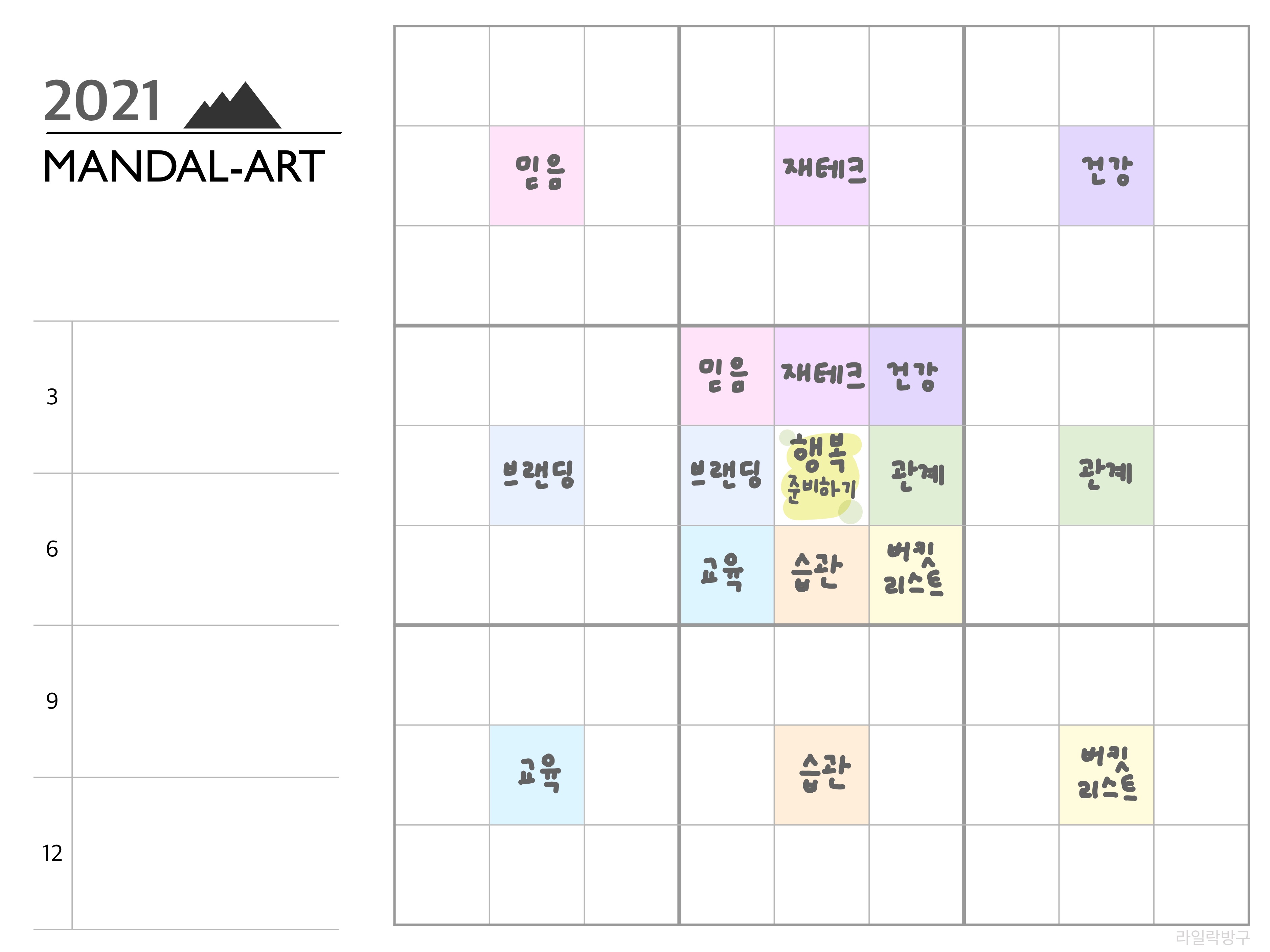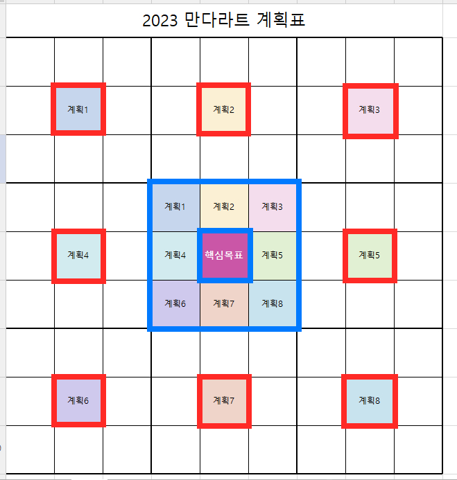 혹시 만다라트 계획표가 필요하신 분은 아래 파일에서 받아가시기 바랍니다. 양식이라는 게 없을 정도로 간단하지만 올 한 해를 제대로 실천해서 목표를 달성하려는 분들에게는 도움이 될 것이다. 만다라토 계획표 양식 첨부 파일 만다라토 계획표 양식.xlsx 파일 다운로드