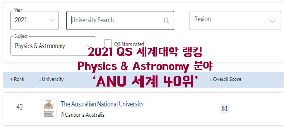 ‘2021 QS 세계 대학 랭킹 – Physics & Astronomy 분야’ ANU 오스트레일리아 국립 대학 세계 40위