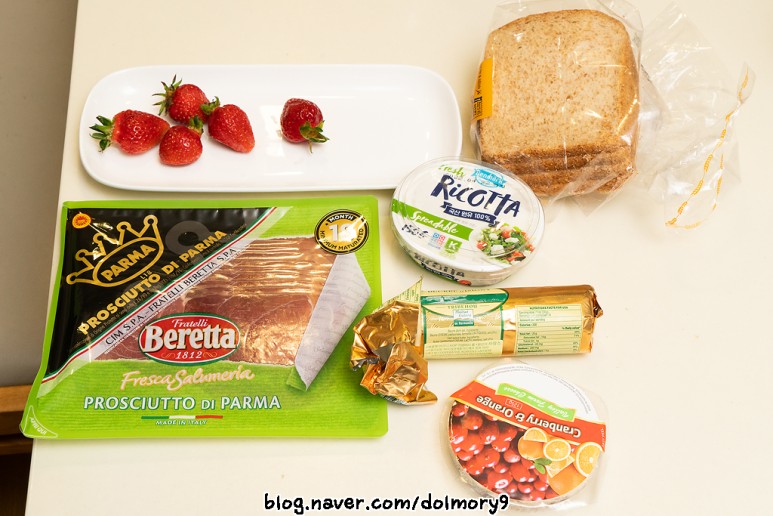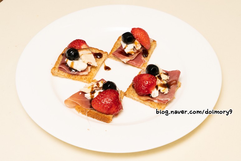 ▲프로슈토햄을 올리고, 과일 치즈와 리코타 치즈, 블랙 올리브, 딸기를 올리고, 발사믹 그레이즈를 올리면 완성