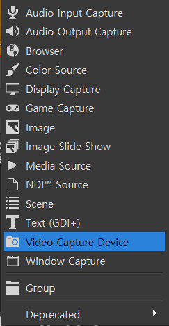 이번에는 Audio Input Capture를 추가해서 마이크 소리를 잡아보도록 하겠습니다 제가 접속한 캡처보드에는 아래와 같은 이름으로 마이크가 설정되어 있습니다.