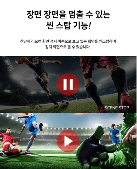 해당 모델의 기능적인 부분도 보시면 씬 스톱 기능이 있어서 씬을 멈출 수 있습니다리모컨 화면의 정지 버튼으로 간단하게 화면을 씬 스톱하여 정지 화면을 볼 수 있습니다.