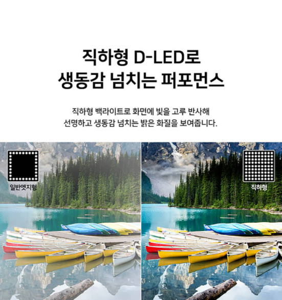 또 직하형 D-LED(백 라이트)로 화면에 빛을 쏘아 역동적인 화질을 경험할 수 있는데 액션, 어드벤처 영화를 감상할 때 몰입도를 더욱 높이는 부분이라고 생각합니다.