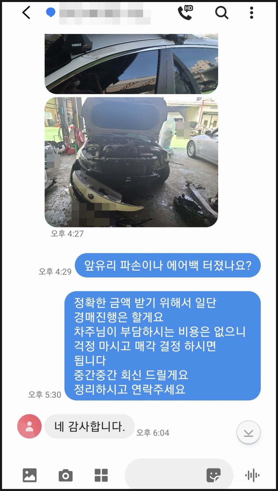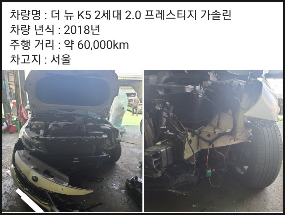 물론 사설 견인업체는 전부 그렇지는 않고 일부 업체의 얘기이고 사고 현장의 교통 통제로 2차 사고를 예방하고 신속한 사고 처리로 교통 혼잡도 막아주는 중요한 역할도 하고 정해진 요금만 청구하는 견인업체도 있습니다.차주에게 사고 차량 사진을 요청하고 회원사 정비공장에 사진을 전달해 엔진 미션에 문제가 없으면 추가 비용 발생 없이 500만원에 완벽하게 수리가 가능하다는 연락을 받았습니다.