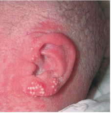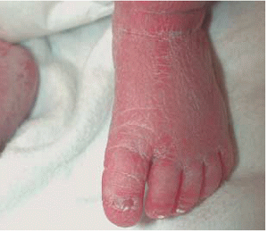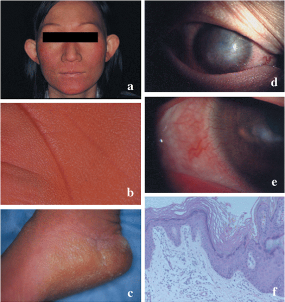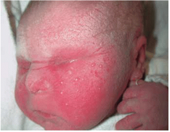Figure 2. 콕콕 난 부분, 눈썹이나 속눈썹의 탈모. 안면홍반과 유두종성 과각화증(at birth).