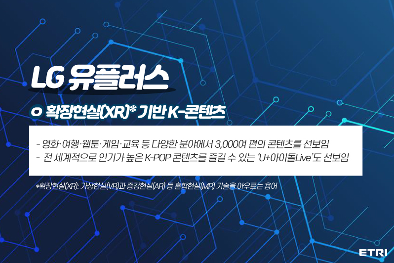 LG유플러스○증강현실(XR) *기반의 K-콘텐츠 LG유플러스는 MWC2022에서 XR 콘텐츠를 선보였습니다. 지난해 11월 출시된 ‘U+DIVE’ 앱을 통해 가상현실(AR), 증강현실(AR) 영화공연뿐 아니라 여행, 웹툰, 게임, 교육 등 다양한 분야에서 3,000여 편의 콘텐츠를 선보였습니다. 특히 전 세계적으로 인기를 끌고 있는 K-POP 콘텐츠를 즐길 수 있는 ‘U+아이돌 Live’도 선보였습니다