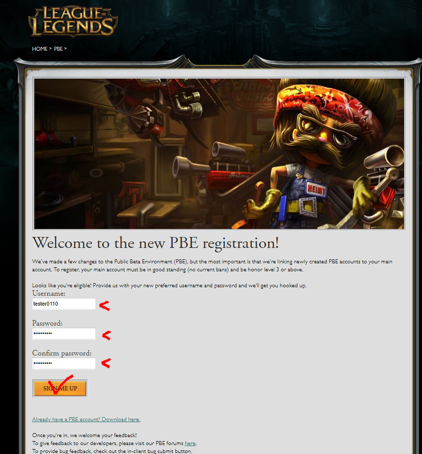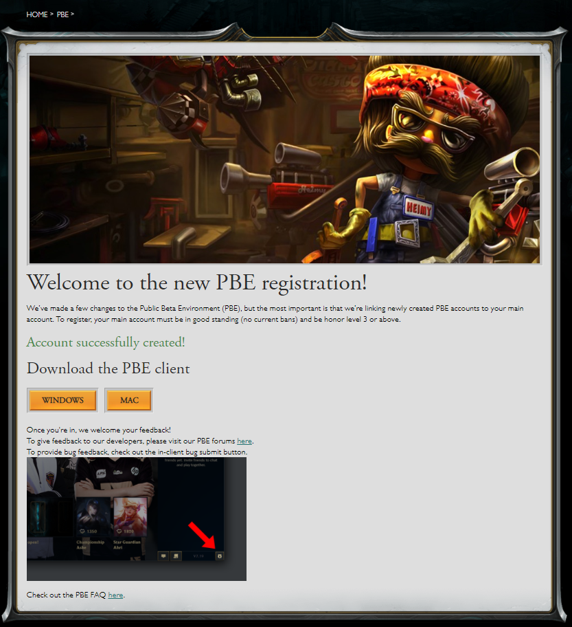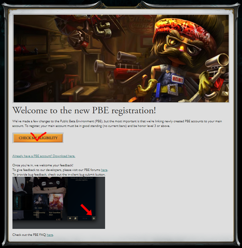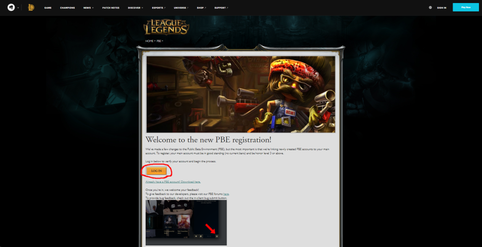 https://pbesignup.na.leagueoflegends.com/en_US/pbeWelcome to the new PBE registration! We’ve made a few changes to the Public Beta Environment (PBE), but the most important is that we’re linking newly created PBE accounts to your main account. To register, your main account must be in good standing (no current bans) and be honor level 3 or above. O…pbesignup.na.leagueoflegends.com