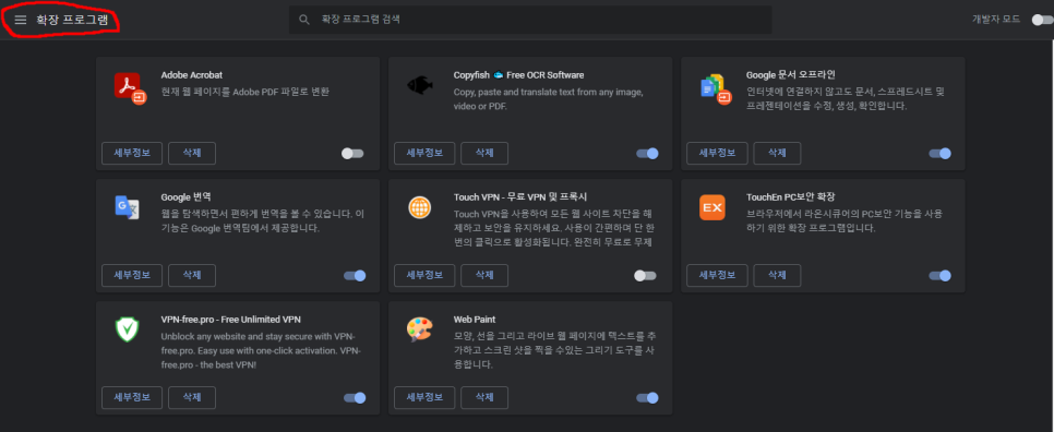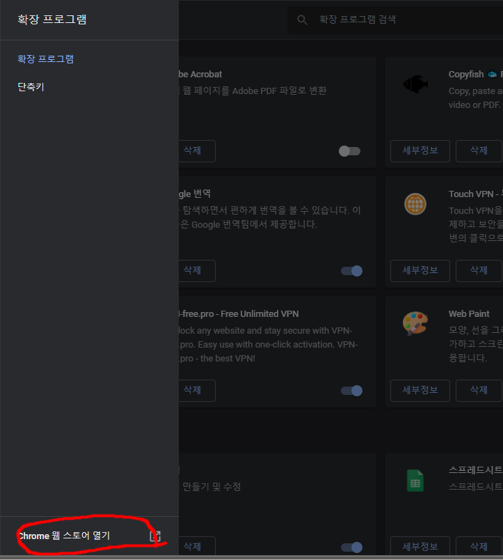 좌측 상단의 ‘확장 프로그램’을 클릭하여 웹스토어를 엽니다.