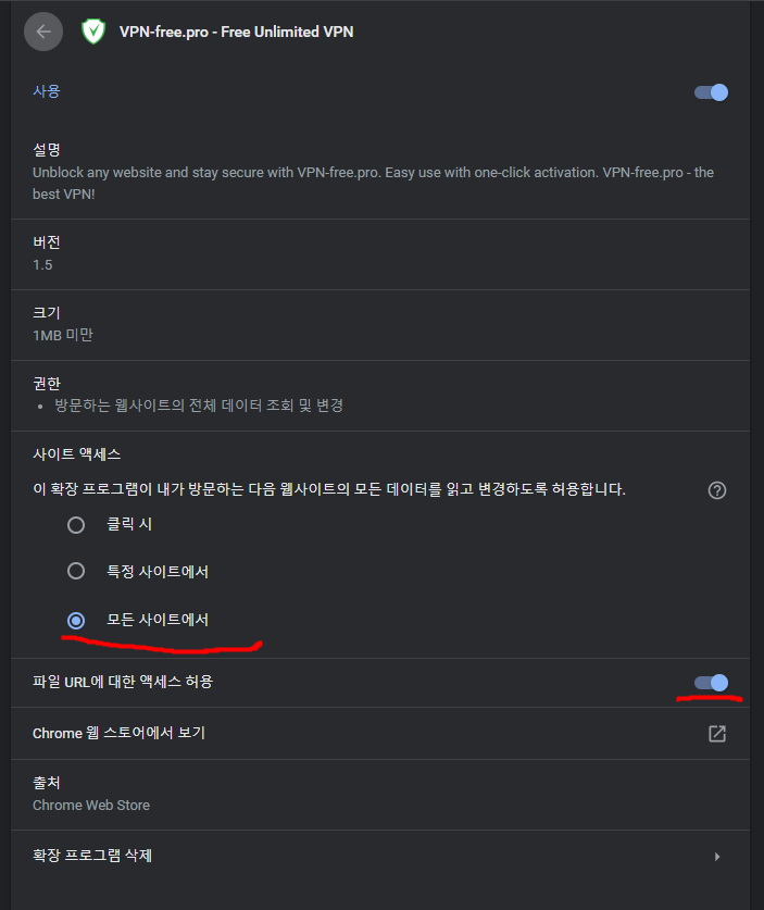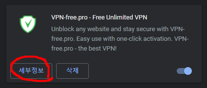 그럴 경우 툴 확장 프로그램에 들어가서 VPN의 “상세정보”를 클릭하여 권한을 모두 주면 문제가 해결됩니다.