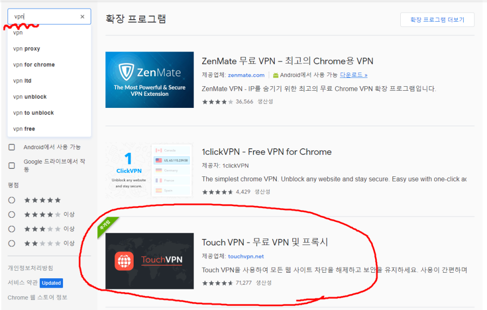 웹스토어에서 ‘VPN’을 검색하고 ‘Touch VPN’을 설치합니다.
