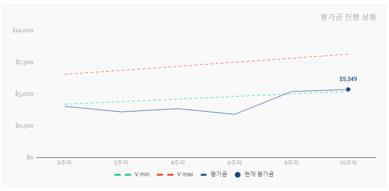 위의 그래프를 보시면 알겠지만, 투자를 시작한 시점부터 한번도 Vmax상단에 접근한 적이 없습니다. 다행히, 그래도 Vmin 하단 근처까지는 주가가 올랐습니다.