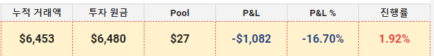 약 10년 동안 투자를 하는 방법입니다 그래서 진행률은 약 2% 수준에 아직 지나지 않습니다. 투자 원금은 6,480$이고, 현금으로 남은 금액은 27$ 수준입니다. 현재 -16.7%의 하락률을 보이고 있습니다. 한때 -30%를 넘게 하락하였기 때문에 상대적으로 지금의 하락이 양호해 보입니다. 약 – 現在 の 정도의 평가손을 겪고 있습니다.