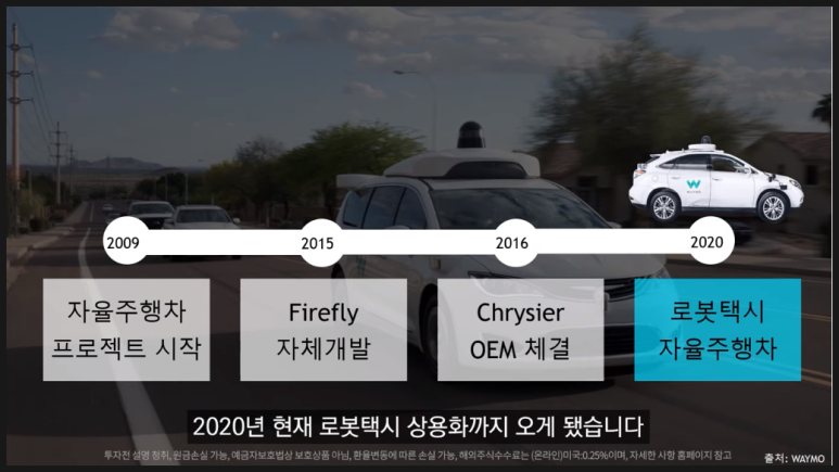 출처 : 진텍TV-자율주행 프로젝트 투자과정, 2009년 자율주행차 프로젝트를 시작으로 2015년 Firefly 자체 개발차량을 출시하였으나 큰 성과가 없어 이후 차량 대부분이 OEM 형태로 전환하였습니다. 이에 따라 2016년 크라이슬러와 OEM을 체결하고 자율주행 테스트를 계속해 2020년 로봇택시 자율주행차로까지 전환되었습니다.20년 10월, 트럭을 제조하는 다임러 트럭과의 제휴를 발표해, 트럭 운송에도 자동 주행을 도입하려고 하고 있습니다.