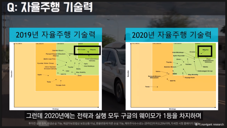 출처 : 진택TV-자율주행기술력 Navigant Research 자율주행기술력 평가에서 2019년에는 전략면에서 구글이 1위였으나 실행부분에서는 GM이 앞서는 모습이었습니다. 근데 2020년에는 모두 waymo가 1위를 차지했습니다