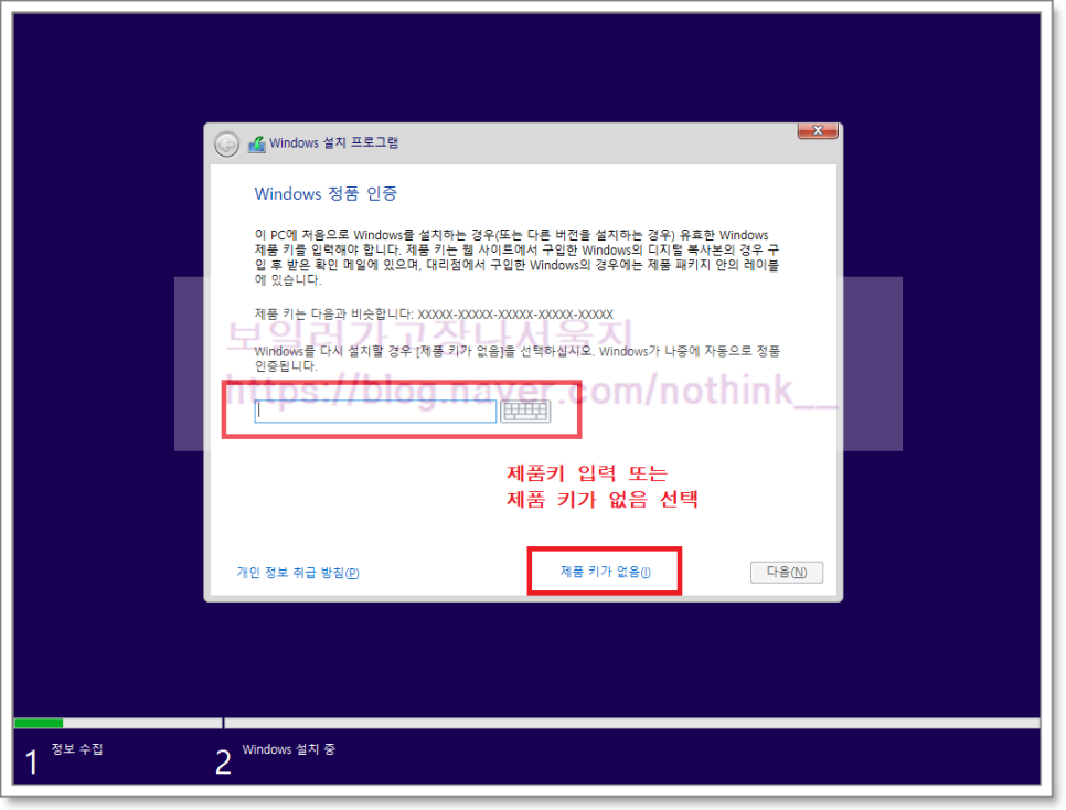 Windows 정품 인증 페이지로 전송되어 제품키 입력과 제품키가 없음을 클릭합니다. DSP 소속 시리얼 키를 사용하신 분은 제품 키가 없는 것을 누르시면 향후 인터넷 접속시 자동으로 정품 인증이 진행됩니다.