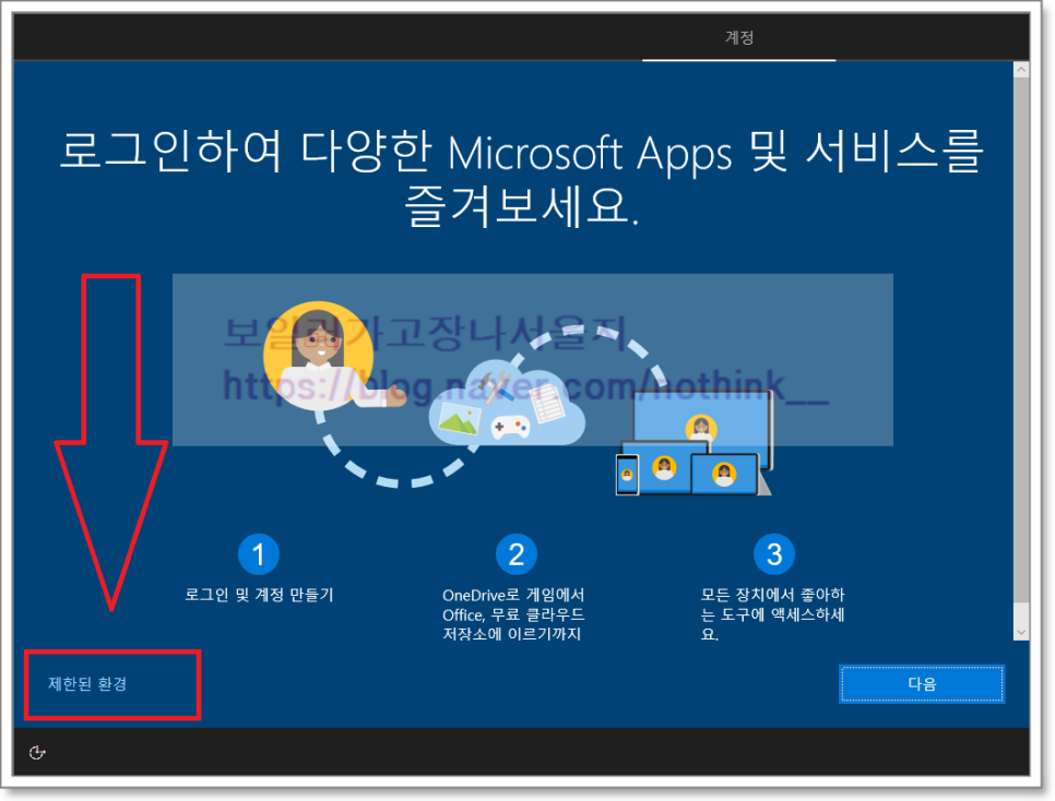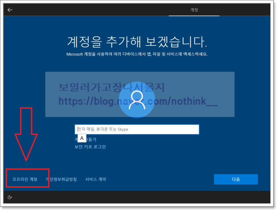 계정 추가 화면이 나오는데 마이크로소프트 계정을 만드는 데 시간이 걸리기 때문에 왼쪽에 있는 오프라인 계정을 클릭합니다.