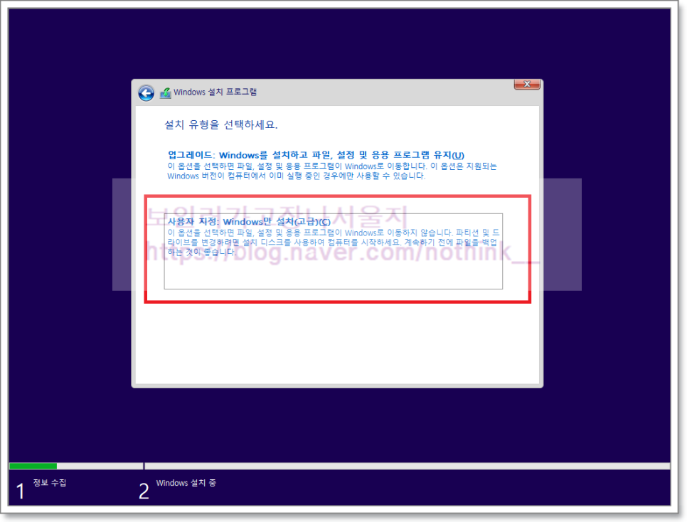 업그레이드가 아니므로 두 번째 항목의 사용자 지정 설치(고급)버튼을 클릭합니다.