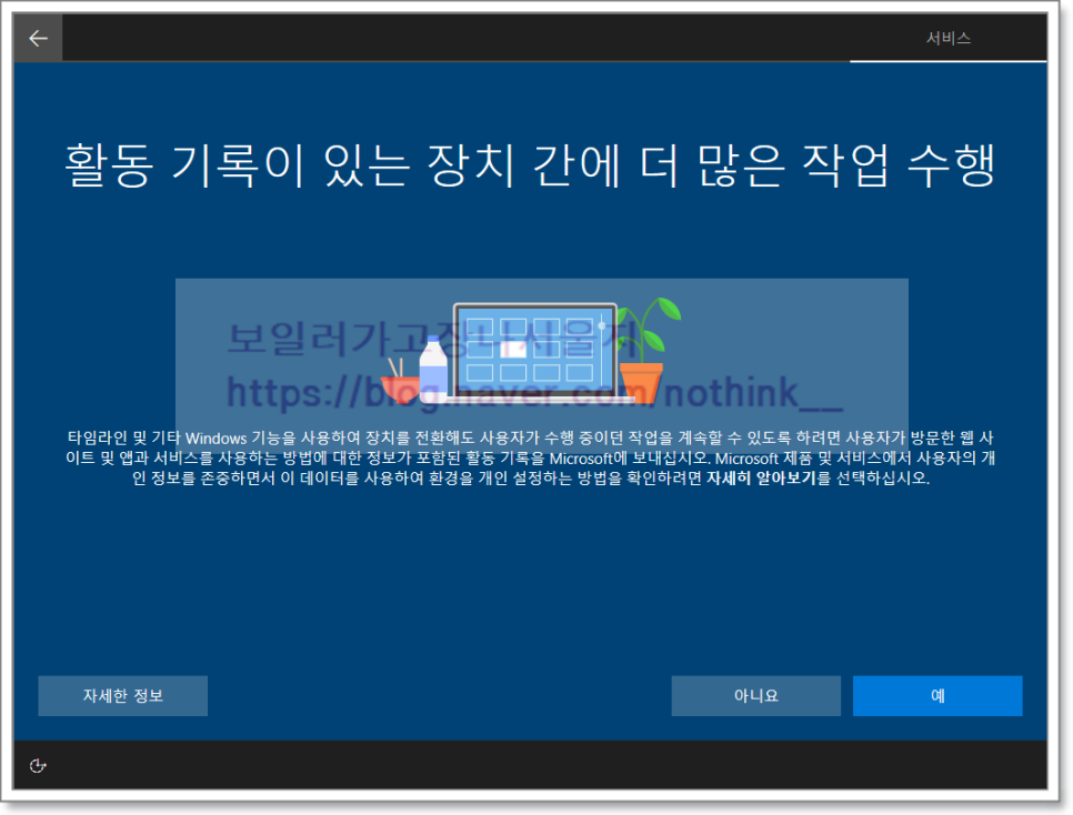 활동기록이 있는 장치들 사이에서 더 많은 작업 수행이 필요하시면 예 버튼을 누르시고 아니요를 누르시면 됩니다. 여기까지설정은끝났습니다. 아니오를 눌러도 나중에 변경이 가능하기 때문에 크게 걱정하지 않으셔도 됩니다.