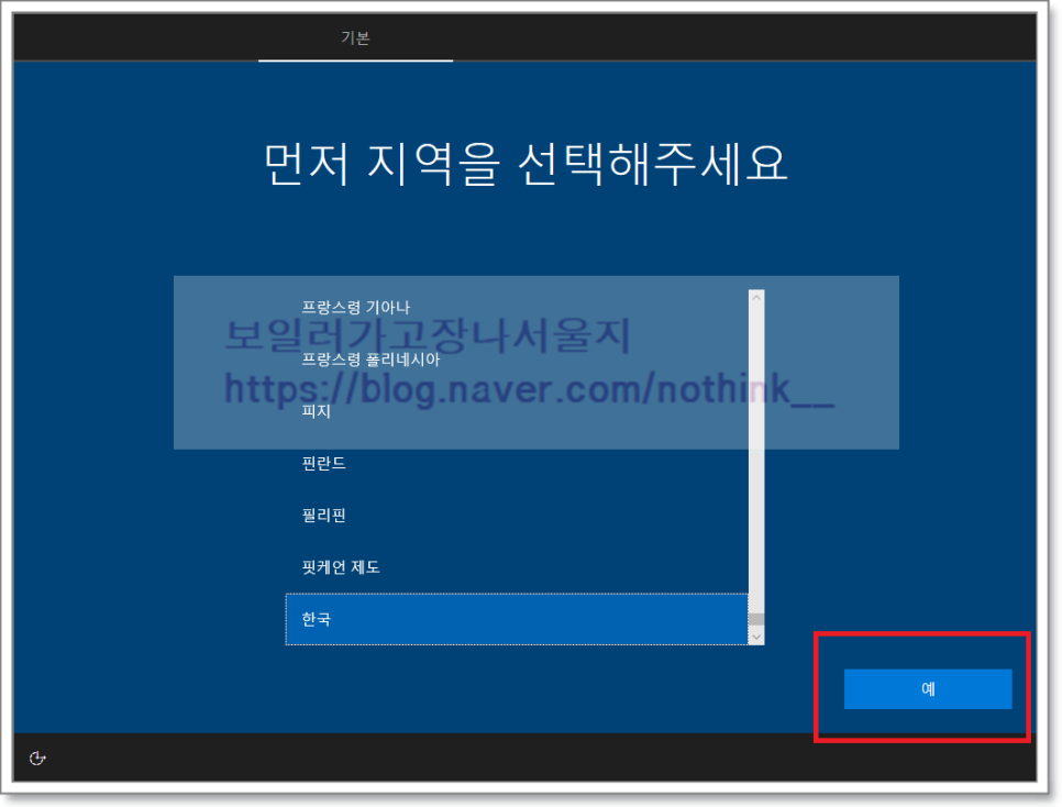 완료 후 먼저 표시되는 화면은 지역선택입니다. 당연히 한국이겠죠. 한국을 선택하고 “예” 버튼을 클릭합니다.