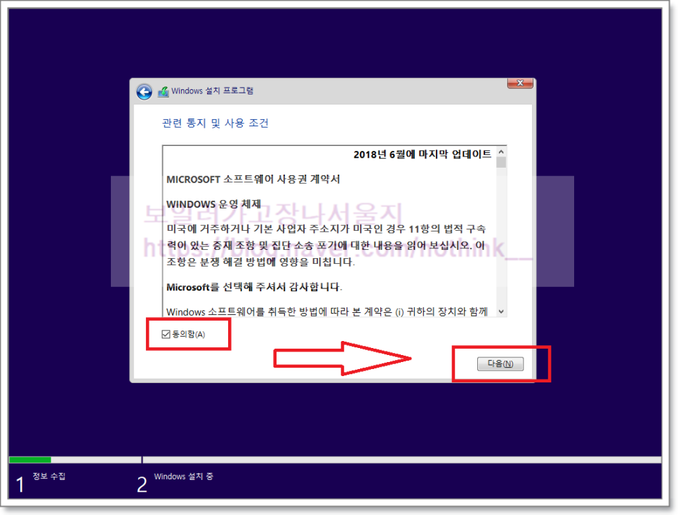 관련 알림 및 사용조건 페이지가 뜨며 좌측 동의함을 체크한 후 우측 다음 버튼을 누릅니다.