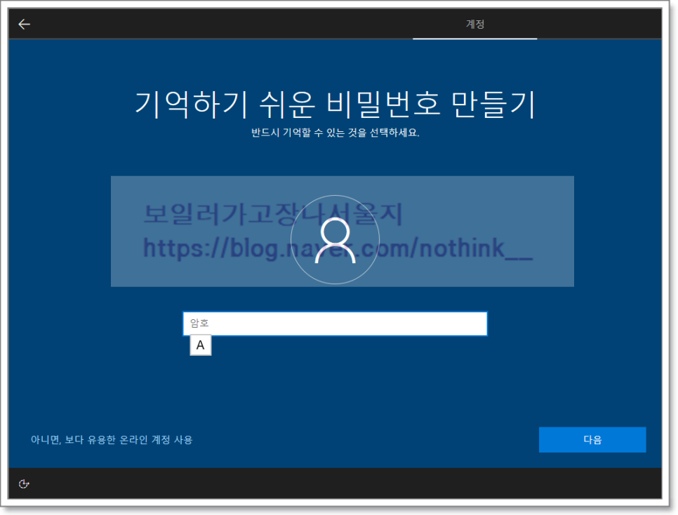 비밀번호를 설정하거나 하고 싶지 않은 경우 공백 상태에서 다음 버튼을 클릭합니다.