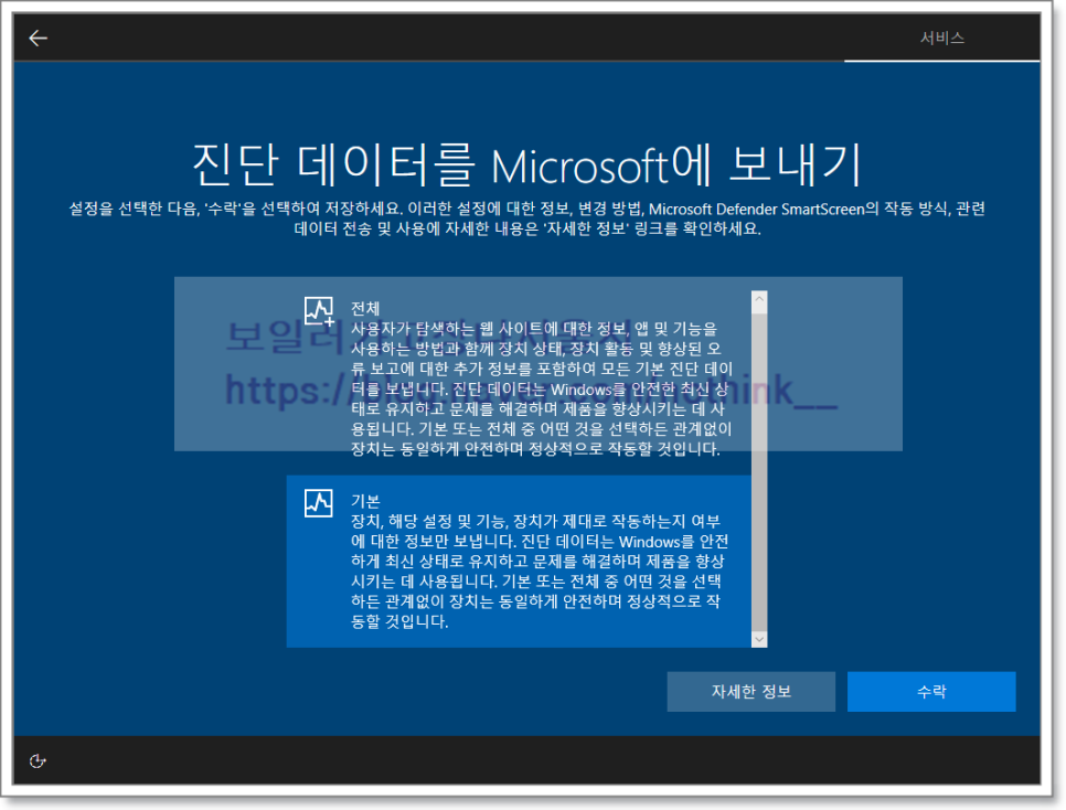 진단 데이터를 전송합니다. 전체 또는 기본을 선택합니다.